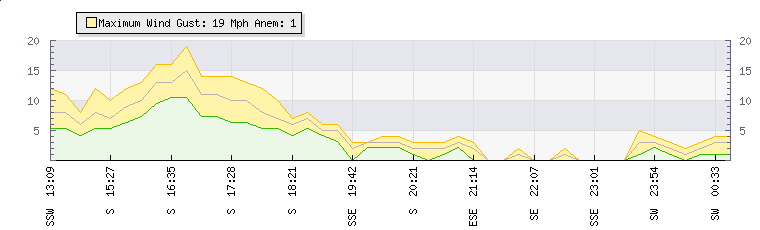 In the last few minutes the wind was South South West at an average speed of 8 mph, reaching up to 11 mph and a low of 5 mph. The gust strength is6 mph above the minimum speed |