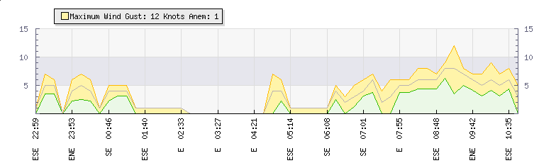 In the last few minutes the wind was Easterly at an average speed of 0 knots, reaching up to 0 knots and a low of 0 knots.  The gust strength is0 knots above the minimum speed             |