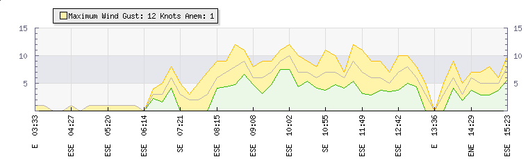 In the last few minutes the wind was Easterly at an average speed of 0 knots, reaching up to 0 knots and a low of 0 knots. The gust strength is0 knots above the minimum speed |