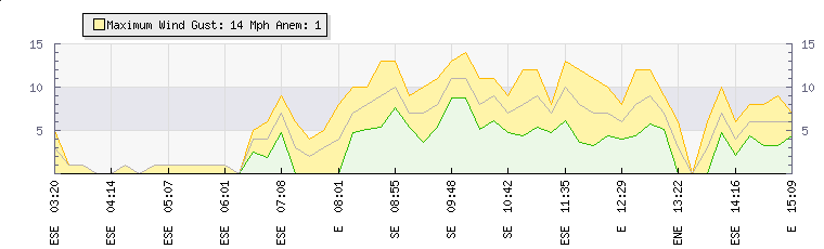 In the last few minutes the wind was Easterly at an average speed of 0 mph, reaching up to 0 mph and a low of 0 mph. The gust strength is0 mph above the minimum speed |