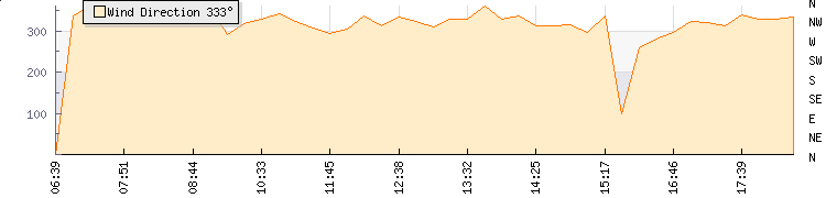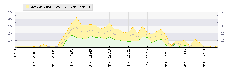 In the last few minutes the wind was North Westerly at an average speed of 6 kmh, reaching up to 12 kmh and a low of 0 kmh. The gust strength is12 kmh above the minimum speed |