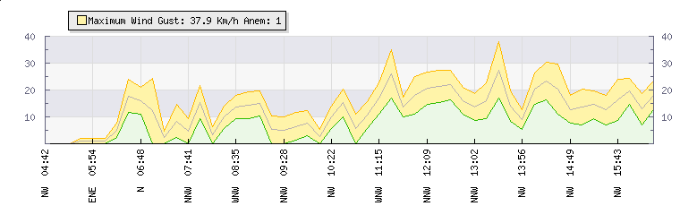 Weather Summary: In the last few minutes the wind was South South East at an average speed of 1 kmh, reaching up to 2 kmh and a low of 0 kmh. The gust strength is2 kmh above the minimum speed