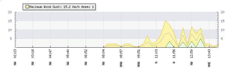 In the last few minutes the wind was North Westerly at an average speed of 1 kmh, reaching up to 2 kmh and a low of 0 kmh. The gust strength is2 kmh above the minimum speed |