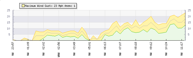 In the last few minutes the wind was North Westerly at an average speed of 13 mph, reaching up to 15 mph and a low of 11 mph. The gust strength is4 mph above the minimum speed |