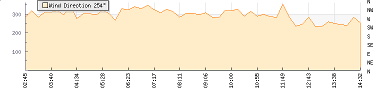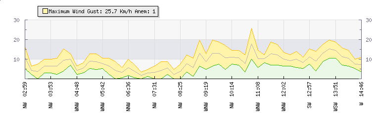 In the last few minutes the wind was South Westerly at an average speed of 9 kmh, reaching up to 14 kmh and a low of 4 kmh. The gust strength is10 kmh above the minimum speed |