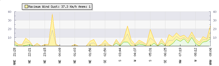 In the last few minutes the wind was South Easterly at an average speed of 3 kmh, reaching up to 5 kmh and a low of 2 kmh. The gust strength is3 kmh above the minimum speed |
