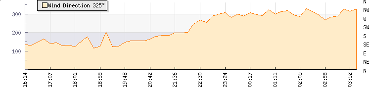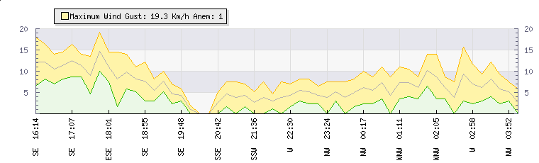 In the last few minutes the wind was North North West at an average speed of 6 kmh, reaching up to 9 kmh and a low of 4 kmh. The gust strength is5 kmh above the minimum speed |