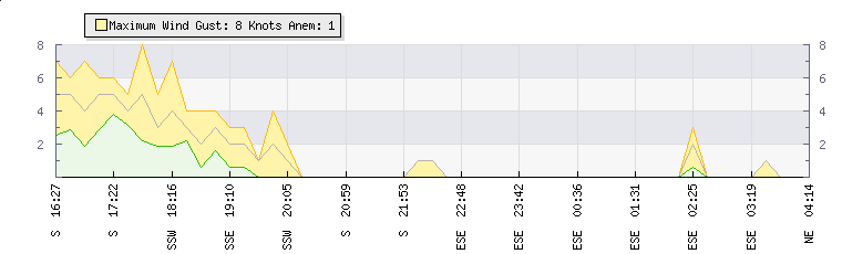 In the last few minutes the wind was East South East at an average speed of 0 knots, reaching up to 0 knots and a low of 0 knots. The gust strength is0 knots above the minimum speed |