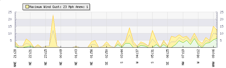 In the last few minutes the wind was South Easterly at an average speed of 2 mph, reaching up to 3 mph and a low of 1 mph. The gust strength is2 mph above the minimum speed |