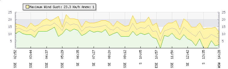 Weather Summary: In the last few minutes the wind was South Westerly at an average speed of 10 kmh, reaching up to 15 kmh and a low of 5 kmh. The gust strength is10 kmh above the minimum speed