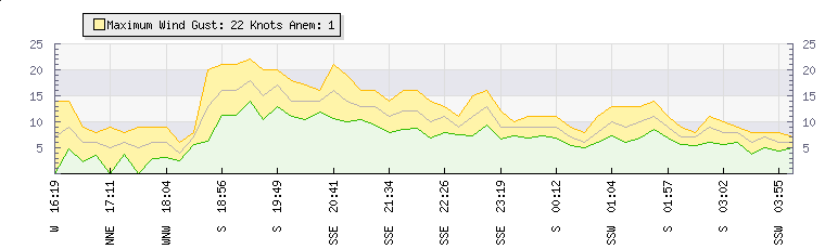 In the last few minutes the wind was South South East at an average speed of 7 knots, reaching up to 8 knots and a low of 5 knots. The gust strength is3 knots above the minimum speed |