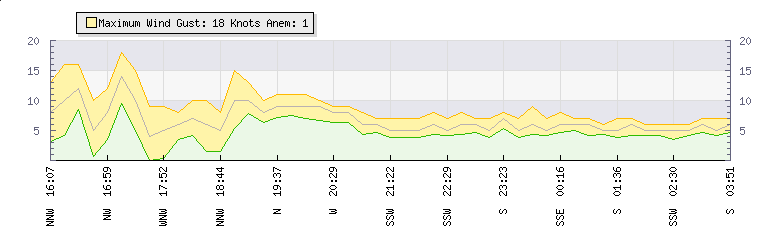 In the last few minutes the wind was South South West at an average speed of 5 knots, reaching up to 6 knots and a low of 3 knots. The gust strength is3 knots above the minimum speed |