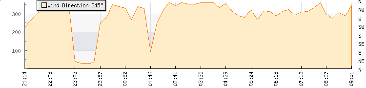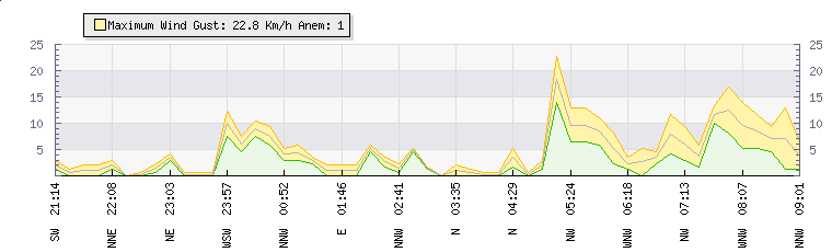 In the last few minutes the wind was Westerly at an average speed of 18 kmh, reaching up to 23 kmh and a low of 14 kmh. The gust strength is9 kmh above the minimum speed |