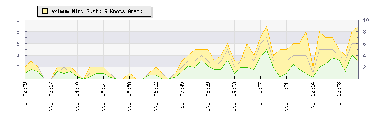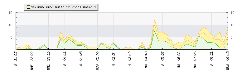 In the last few minutes the wind was North Westerly at an average speed of 5 knots, reaching up to 7 knots and a low of 3 knots. The gust strength is4 knots above the minimum speed |