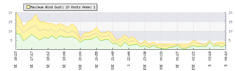 In the last few minutes the wind was East South East at an average speed of 4 knots, reaching up to 5 knots and a low of 2 knots. The gust strength is3 knots above the minimum speed |
