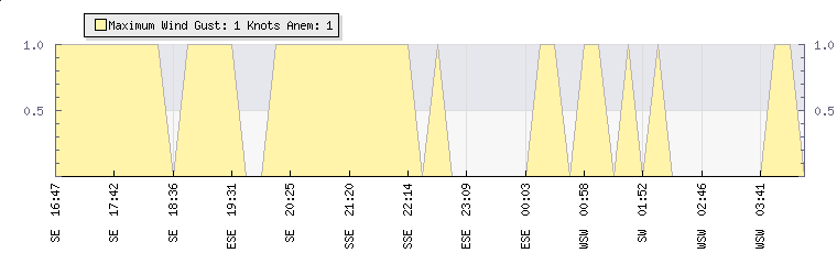 In the last few minutes the wind was West South West at an average speed of 0 knots, reaching up to 0 knots and a low of 0 knots. The gust strength is0 knots above the minimum speed |