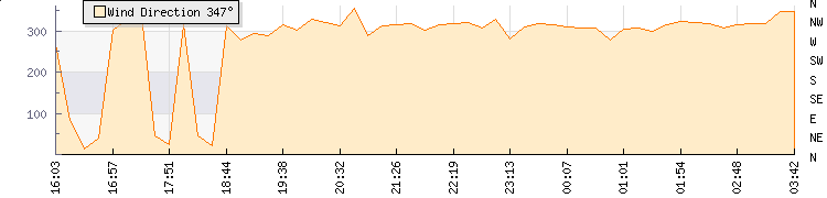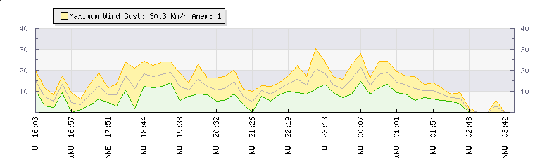 In the last few minutes the wind was North Westerly at an average speed of 7 kmh, reaching up to 9 kmh and a low of 4 kmh. The gust strength is5 kmh above the minimum speed |