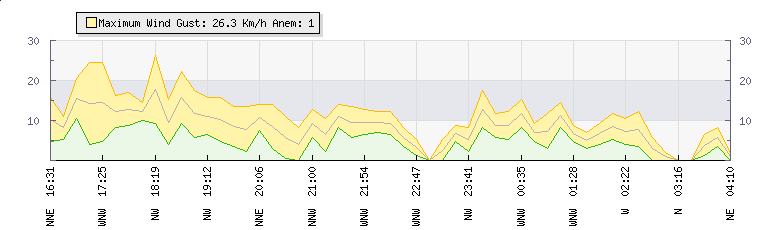In the last few minutes the wind was Westerly at an average speed of 7 kmh, reaching up to 11 kmh and a low of 4 kmh. The gust strength is7 kmh above the minimum speed |