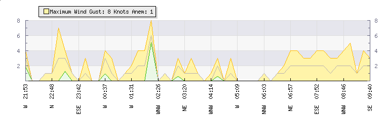 In the last few minutes the wind was Westerly at an average speed of 0 knots, reaching up to 0 knots and a low of 0 knots. The gust strength is0 knots above the minimum speed |
