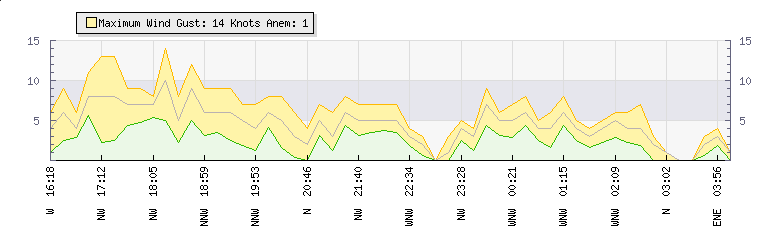 In the last few minutes the wind was Westerly at an average speed of 4 knots, reaching up to 6 knots and a low of 2 knots. The gust strength is4 knots above the minimum speed |