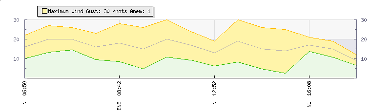 In the last few minutes the wind was Westerly at an average speed of 15 knots, reaching up to 19 knots and a low of 11 knots. The gust strength is8 knots above the minimum speed |