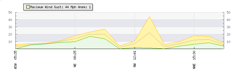In the last few minutes the wind was Easterly at an average speed of 1 mph, reaching up to 1 mph and a low of 0 mph. The gust strength is1 mph above the minimum speed |