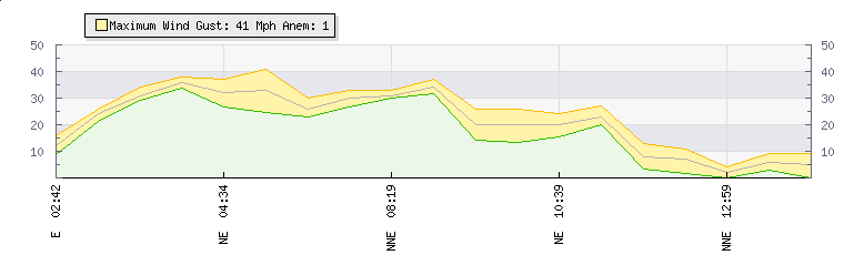 In the last few minutes the wind was North North East at an average speed of 7 mph, reaching up to 11 mph and a low of 2 mph. The gust strength is9 mph above the minimum speed |