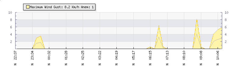 In the last few minutes the wind was Northerly at an average speed of 4 kmh, reaching up to 8 kmh and a low of 0 kmh. The gust strength is8 kmh above the minimum speed |
