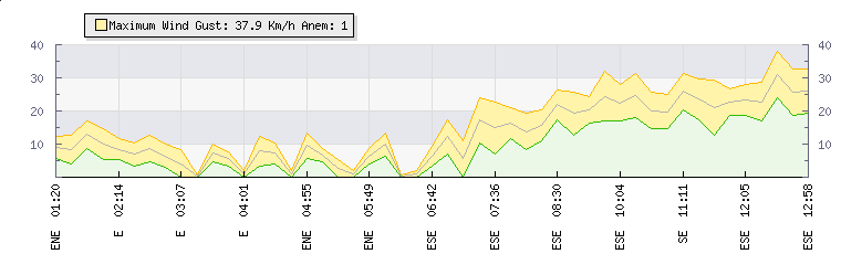 In the last few minutes the wind was East South East at an average speed of 25 kmh, reaching up to 32 kmh and a low of 18 kmh. The gust strength is14 kmh above the minimum speed |