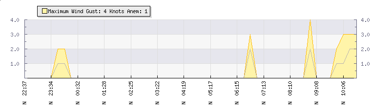In the last few minutes the wind was Northerly at an average speed of 0 knots, reaching up to 0 knots and a low of 0 knots. The gust strength is0 knots above the minimum speed |