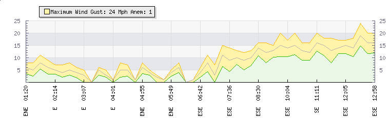 In the last few minutes the wind was East South East at an average speed of 15 mph, reaching up to 20 mph and a low of 11 mph. The gust strength is9 mph above the minimum speed |