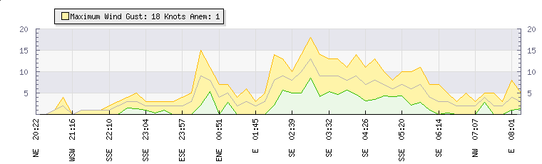 In the last few minutes the wind was North Westerly at an average speed of 2 knots, reaching up to 5 knots and a low of 0 knots. The gust strength is5 knots above the minimum speed |