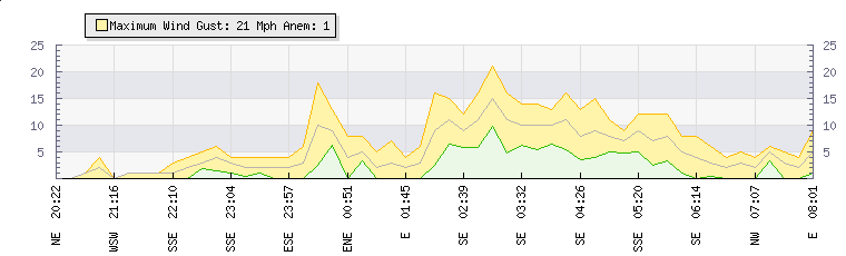 In the last few minutes the wind was North Easterly at an average speed of 2 mph, reaching up to 4 mph and a low of 0 mph. The gust strength is4 mph above the minimum speed |
