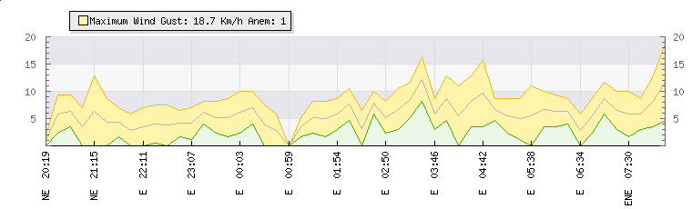 Weather Summary: In the last few minutes the wind was East North East at an average speed of 6 kmh, reaching up to 9 kmh and a low of 2 kmh. The gust strength is7 kmh above the minimum speed