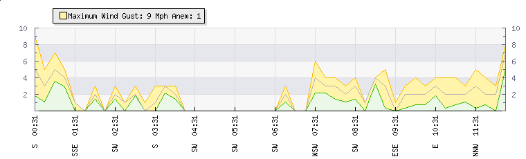 In the last few minutes the wind was East North East at an average speed of 2 mph, reaching up to 4 mph and a low of 0 mph. The gust strength is4 mph above the minimum speed |