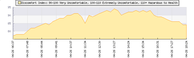 | Wind Speed: | 2|12|22 kmh | Wind Direction: | ENE 75° | Temperature: | 25.9°C | | Wet Bulb: | 17.1°C | Discomfort: | 86 | Humidity: | 40% | | Rainfall Today: | 0mm | 12 hrs Rainfall: | 0mm | 24 hrs Rainfall: | 0mm | | Barometer: | 898.2mb | Dew Point: | 11.3°C | Clouds AGL: | 5859ft (1786 m) | | Density-Alt: | 9639ft (2938 m) | Fire Danger: | |