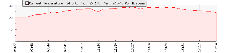 | Wind Gust: | 32 km/h | Min Temp: | 20.4 °C | Max Temp: | 29.1 °C | | Wind Average: | 16 km/h | Min Hum: | 37 % | Max Hum: | 64 % | |  |