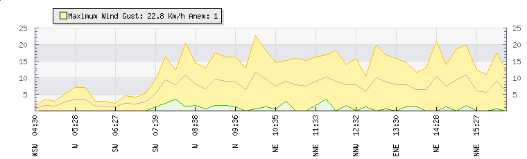 Weather Summary: In the last few minutes the wind was South Westerly at an average speed of 8 kmh, reaching up to 13 kmh and a low of 2 kmh. The gust strength is11 kmh above the minimum speed