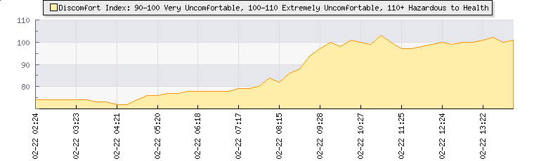 | Wind Speed: | 2|6|10 knots | Wind Direction: | SSW 200° | Temperature: | 30.5°C | | Wet Bulb: | 22.2°C | Discomfort: | 99 | Humidity: | 47% | | Rainfall Today: | 0mm | 12 hrs Rainfall: | 0mm | 24 hrs Rainfall: | 3.6mm | | Barometer: | 902.3mb | Dew Point: | 17.9°C | Clouds AGL: | 5043ft (1537 m) | | Density-Alt: | 10049ft (3063 m) | Solar Radiation: | 750Wm² | Fire Danger: | |