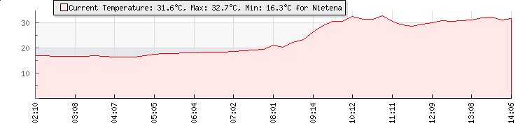| Wind Gust: | 13 knots | Min Temp: | 16.3 °C | Max Temp: | 32.7 °C | | Wind Average: | 8 knots | Min Hum: | 38 % | Max Hum: | 97 % | |  |