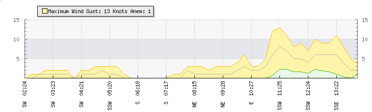 In the last few minutes the wind was South South West at an average speed of 6 knots, reaching up to 10 knots and a low of 2 knots. The gust strength is8 knots above the minimum speed |