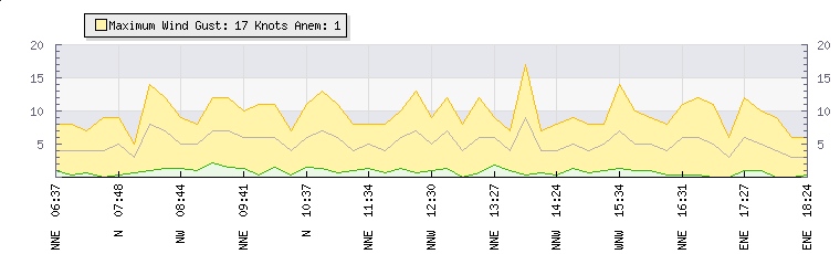 In the last few minutes the wind was East North East at an average speed of 6 knots, reaching up to 12 knots and a low of 1 knots. The gust strength is11 knots above the minimum speed |