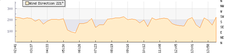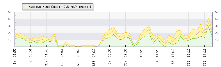 In the last few minutes the wind was South Westerly at an average speed of 12 kmh, reaching up to 16 kmh and a low of 8 kmh. The gust strength is8 kmh above the minimum speed |