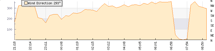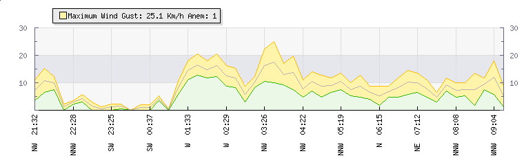 In the last few minutes the wind was North North West at an average speed of 11 kmh, reaching up to 13 kmh and a low of 8 kmh. The gust strength is5 kmh above the minimum speed |