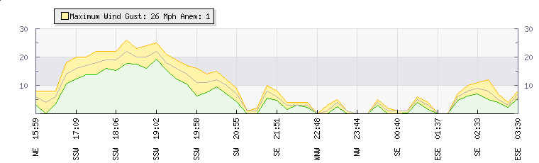 In the last few minutes the wind was South Easterly at an average speed of 9 mph, reaching up to 11 mph and a low of 7 mph. The gust strength is4 mph above the minimum speed |