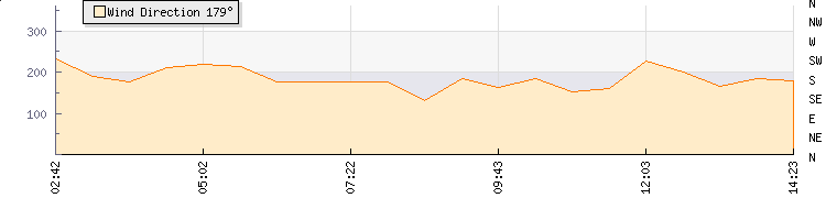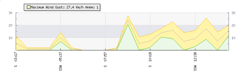 In the last few minutes the wind was South South East at an average speed of 17 kmh, reaching up to 26 kmh and a low of 9 kmh. The gust strength is17 kmh above the minimum speed |