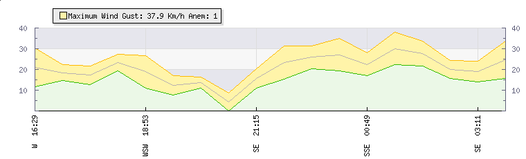 Weather Summary: In the last few minutes the wind was South South East at an average speed of 28 kmh, reaching up to 34 kmh and a low of 22 kmh. The gust strength is12 kmh above the minimum speed