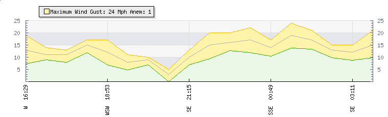In the last few minutes the wind was South South East at an average speed of 17 mph, reaching up to 21 mph and a low of 13 mph. The gust strength is8 mph above the minimum speed |