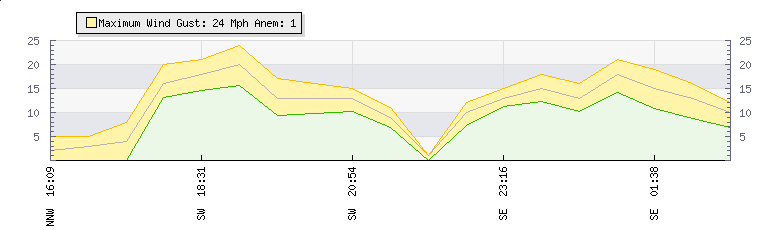 In the last few minutes the wind was South South East at an average speed of 13 mph, reaching up to 16 mph and a low of 9 mph. The gust strength is7 mph above the minimum speed |