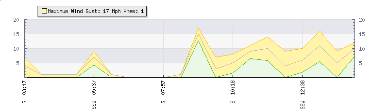 In the last few minutes the wind was South South East at an average speed of 11 mph, reaching up to 16 mph and a low of 5 mph. The gust strength is11 mph above the minimum speed |